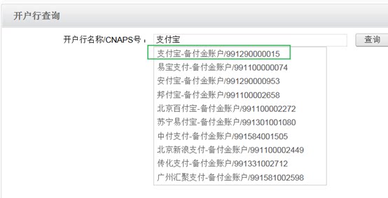 收款人开户行选择:“支付机构备付金集中存管账户”,输入“支付宝-备付金账户”进行模糊搜索,如下图: