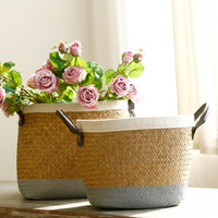 鸟与花家 田园手工海草编花篮 蓝底白边花盆双耳编织篮藤编收纳筐